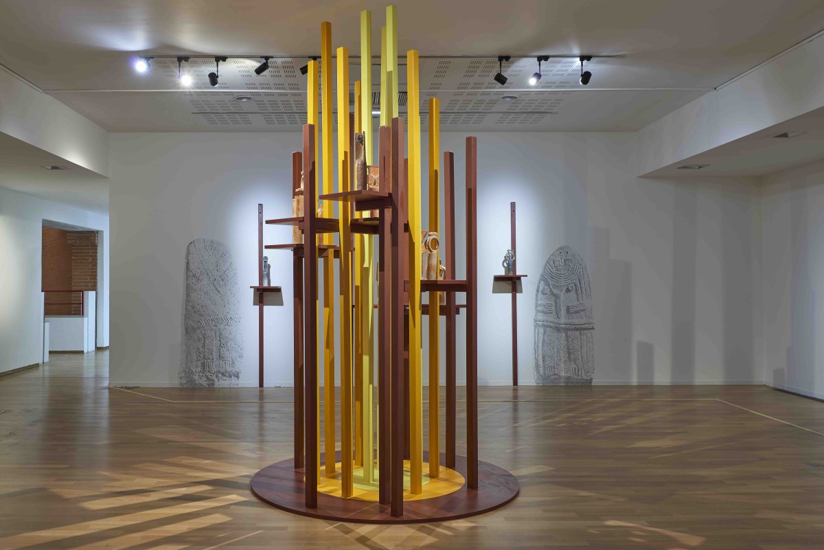 La scénographie imaginée par matali crasset met en regard les oeuvres de Claudine Monchaussé et les statues-menhirs du Musée Fenaille.