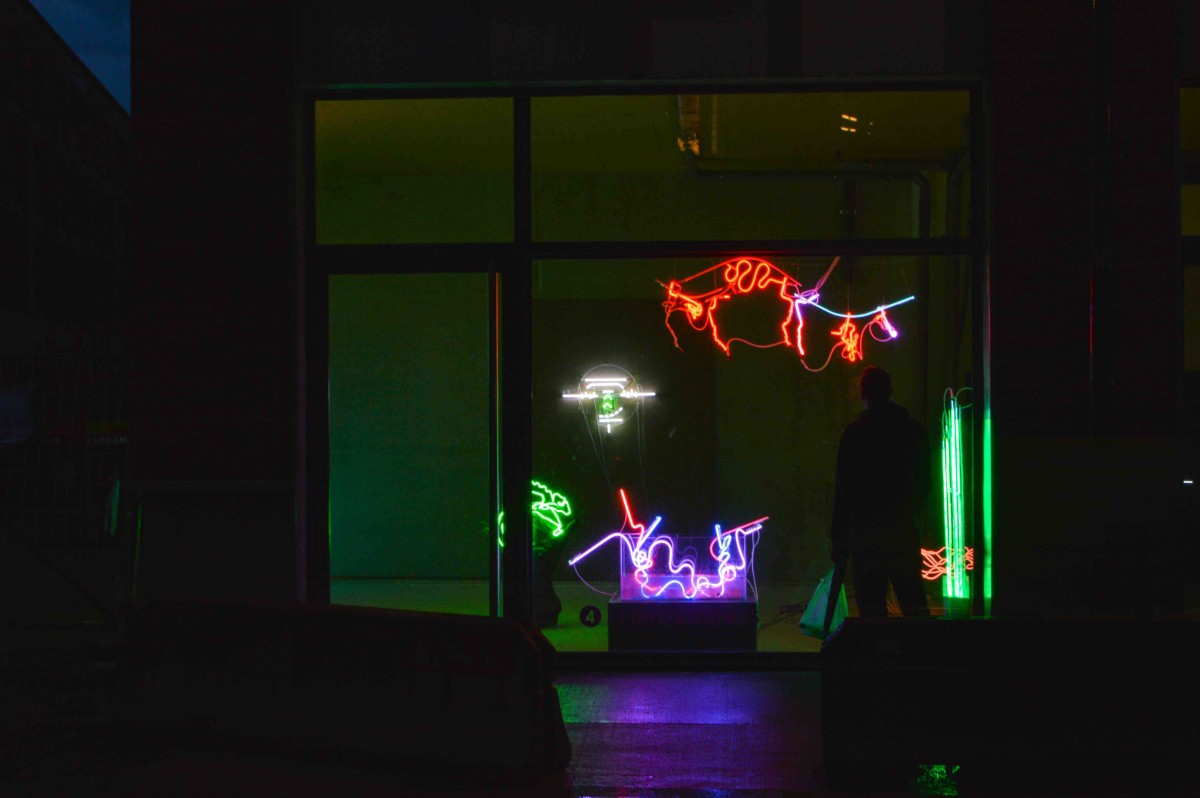 L'exposition Lèche-vitrines est l'aboutissement d'un atelier de production de néons entre des étudiant·e·s en art de l'isdaT et des étudiant·e·s suivant la formation néon au lycée polyvalent et CFA Dorian à Paris.