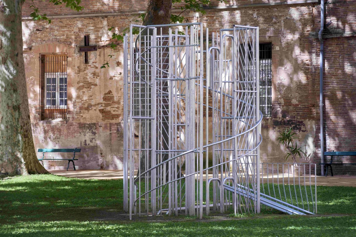 Jennifer Caubet s’intéresse à l’espace, autant à son occupation qu’à sa représentation et l’explore à travers la sculpture, l’installation et le dessin dans un langage formel proche de l’art minimal. Envisageant le territoire comme ressource, Jennifer Caubet a parcouru plusieurs chantiers de démolition toulousains pour s’arrêter sur celui du siège social d'Airbus. Elle y récupère les gardes-corps, les rampes, les portes. Autant d'éléments qui, dans cette architecture, guidaient, protégeaient ou contraignaient les corps. Transformant ces matériaux, les déplaçant et les redéployant dans un autre contexte, Jennifer Caubet nous offre une sculpture labyrinthique, praticable, sinon saisissable, par chacun·e qui peut alors s’y glisser ou s’y installer et peut-être, jouer avec les perceptions, jusqu'à éprouver à son tour, le voyage auquel l’artiste a donné forme : de la ruine à l’utopie, d’un monde révolu à une émancipation nouvelle.